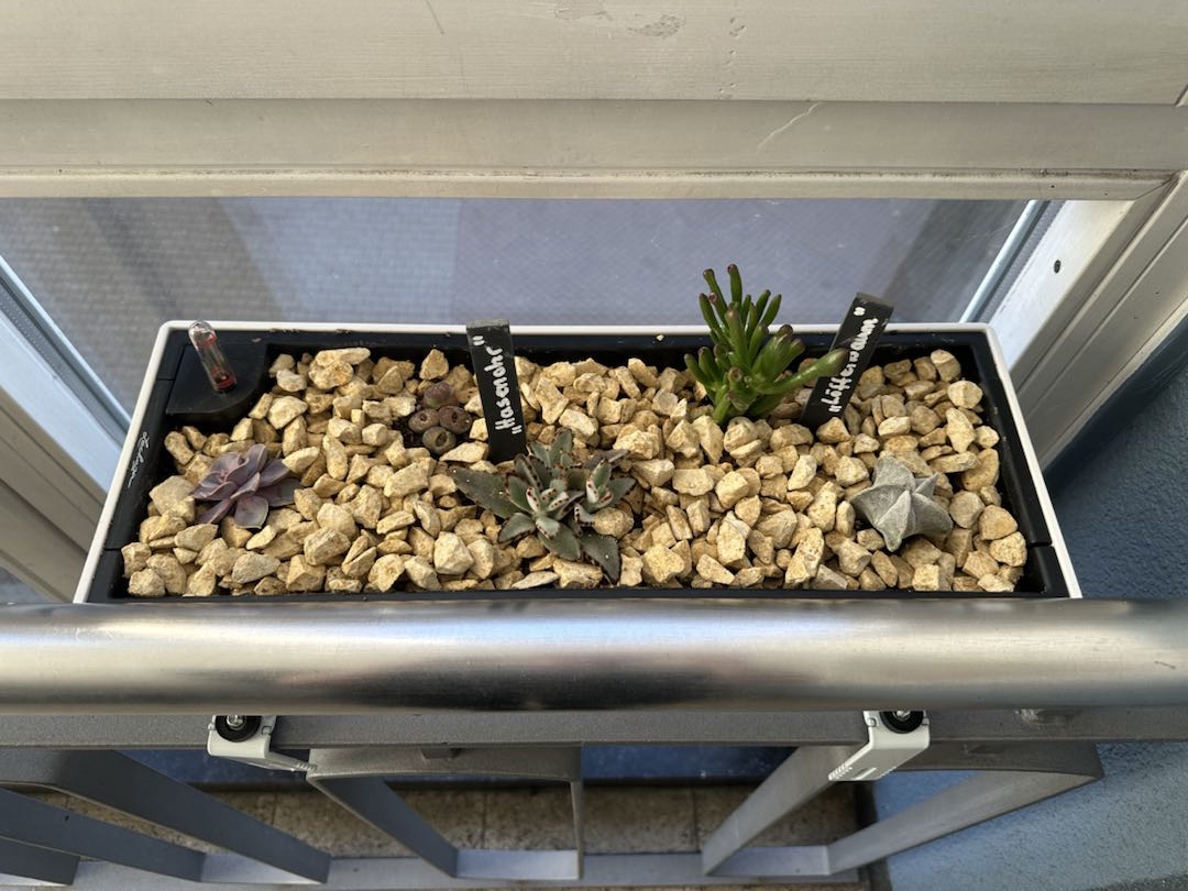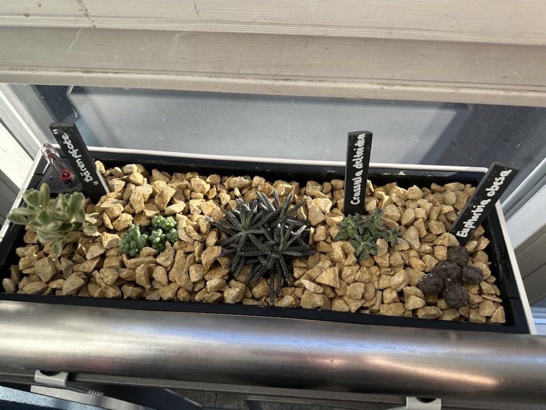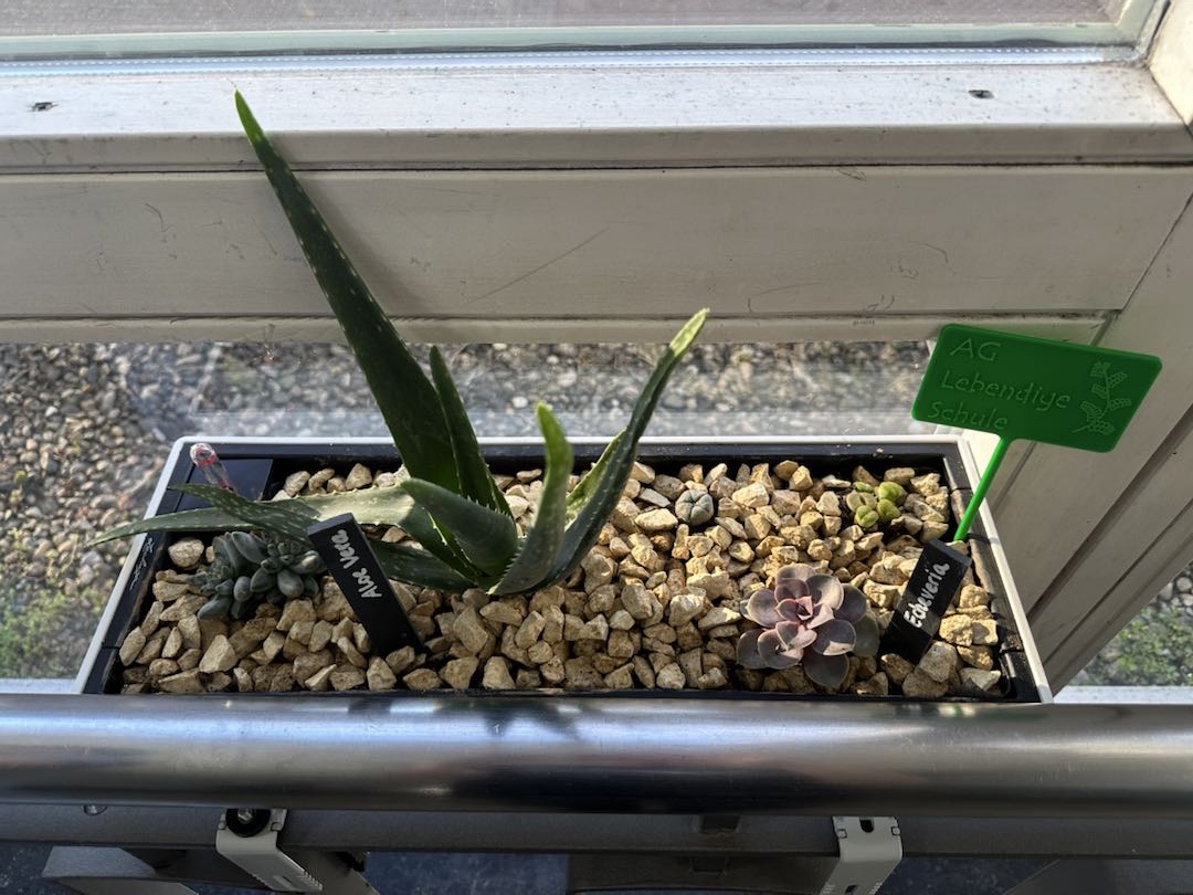 Die neue AG Lebendige Schule hat sich zum Ziel gesetzt, das Schulhaus durch Pflanzen freundlicher zu gestalten. Hierfür wollten wir die vorhandenen Pflanzen nutzen, aber auch weitere, neue Pflanzen hinzufügen. Nachdem wir uns im letzten Schuljahr auf die Vorhandenen konzentriert, ihre Erde erneuert und die Töpfe gereinigt haben, sollte es in diesem Schuljahr an die neuen Pflanzen gehen. Und so begannen wir im Herbst, Ideen zu sammeln, wie und wo die neuen Pflanzen platziert werden könnten. Nach den ersten Recherchen stellten wir fest, dass dies gar nicht so einfach und auf vieles zu achten ist: Wo passen neue Töpfe hin, ohne im Weg zu stehen? Welche Pflanzen können in der Schule verwendet werden? Licht, Luftfeuchtigkeit und auch Wasser sind Faktoren, die bedacht werden mussten. Schnell stand unsere Idee fest: Die Geländer im Treppenhaus boten eine gute Gelegenheit dafür. Nachdem die Schulleitung uns unsere Idee sofort genehmigt hatte, fingen wir an, passende Töpfe zu suchen. Beim Designen der Pflanzenkombinationen wurde unsere Gruppe sehr kreativ und Mitte Februar stand den Besorgungen nichts mehr im Weg. Mit den Designs in der Tasche ging es für einen kleinen Teil der AG für einen Samstagnachmittag ins Gartencenter, und Herr Eberle besorgte uns freundlicherweise die Töpfe. Am Mittwoch, dem 25. Februar 2026, trafen sich dann 5 Schüler:innen mit Herrn Schmidberger und Frau Bertram am Nachmittag, um unsere Idee in die Wirklichkeit umzusetzen. Mit viel Liebe wurde jeder einzelne Topf mit verschiedenen Sukkulenten, Lebenden Steinen, Aloe Veras und vielem mehr befüllt. Einer unserer Mitglieder überraschte uns noch mit selbstgedruckten AG-Schildern, die zusammen mit einzelnen Beschriftungen einen Ehrenplatz erhielten. Und so haben wir unserem Treppenhaus ein wenig Leben eingehaucht. Vielleicht zaubert es ja auch Dir bzw. Ihnen ein Lächeln ins Gesicht? Wir wünschen allen viel Spaß beim Anschauen und Bestaunen!