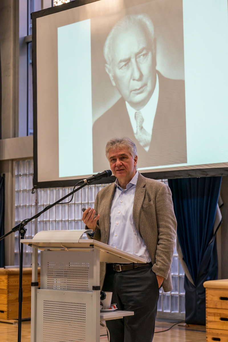 Prof. Ludwig Theodor Heuss lebt als Arzt in der Schweiz, nimmt sich aber immer wieder die Zeit, zu Schülerinnen und Schülern zu sprechen und ihnen so die lebensgestaltenden Werte der Demokratie und Freiheit nahezubringen, die sein Leben ebenso wie das seines Großvaters bestimmen. In seinem Vortrag „Theodor Heuss – Bürger und Präsident im Zeitalter der Extreme“ zeichnete er heute in der Jahnhalle für uns dessen Leben nach, teilte Fotos aus dem familiären Umfeld ebenso wie unterschiedliche Anekdoten mit uns. So erfuhren wir, dass Theodor Heuss nicht immer ein guter oder einfacher Schüler gewesen sei, aber sein Leben lang wissbegierig und auch fleißig.