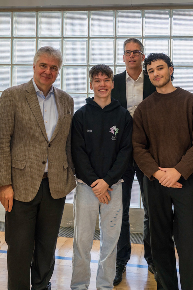 Nach einer Begrüßung unseres Schulleiter, Harald Philipps, und einer kurzen Ansprache von Dr. Hans-Ulrich Ruelke, der gemeinsam mit Prof. Erik Schweigert, den Besuch mit Herrn Prof. Ludwig Theodor Heuss an den Theodor-Heuss-Gymnasien Pforzheim und Mühlacker organisierte, übernahmen Levin Birr und David Martini (beide J2) für den Demokratie-Club die Moderation der Veranstaltung. Wer nach ihrem kleinen Warm-up-Quiz zu unserem Namensgeber Lust auf mehr Fragen rund ums Thema Demokratie hat, dem sei der Demokrat-O-Mat der theodor heuss stiftung ans Herz gelegt!