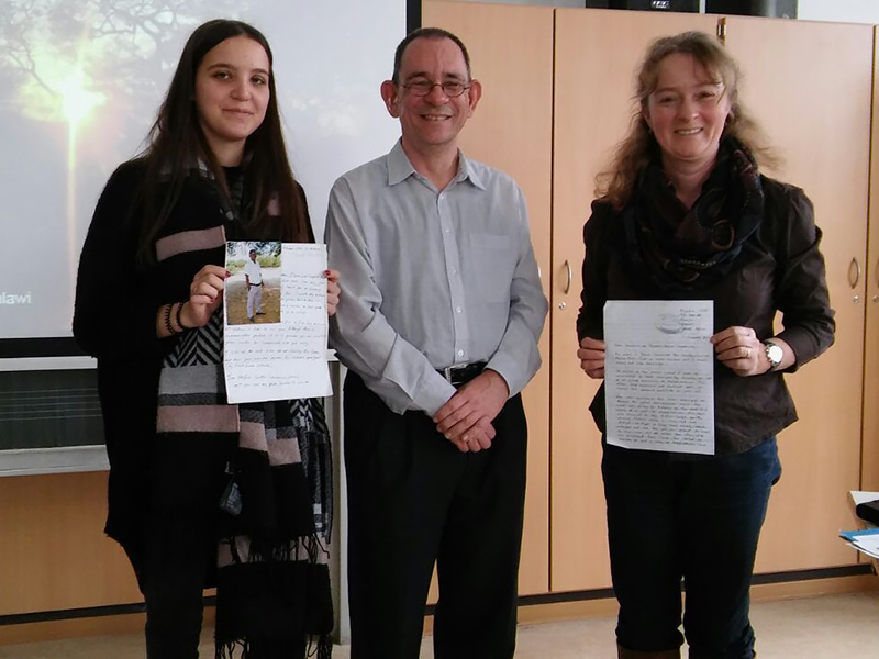 Austausch, Interesse an Menschen aus anderen Ländern und ihren Gewohnheiten ist auch unseren Schülern sehr wichtig und so beteiligen sich inzwischen etliche Schüler am Briefkontakt mit der Partnerschule. Am Freitag gab es denn auch viele freudige Gesichter, als Herr Mattheus die Antwortbriefe, die er vom letzten Besuch im November mitgebracht hatte, an die jeweiligen Schüler höchstpersönlich überreichte. Daneben gab es auch Briefe, die auf neue Partner warteten und schnell verteilt werden konnten; und wenn die Achtklässler nun im Erdkunde-Unterricht das Thema „Malawi“ behandeln, haben sie sicher einen ganz anderen Zugang zu diesem fernen Land als vorher und hoffentlich Interesse, durch Briefe oder andere Projekte zum gegenseitigen Kennenlernen beizutragen.