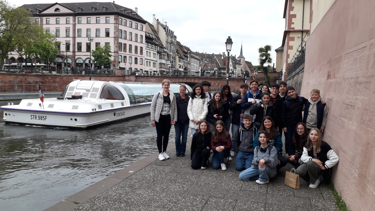 Anschließend gingen wir zu einer Bootstour. Bevor wir in das Boot eingestiegen sind, bekamen wir Kopfhörer, mit denen wir Informationen über die Umgebung erhalten konnten. Während der Tour sind wir an dem Viertel Petite France vorbeigefahren und haben dort eine Schleuse passiert. Gegen Ende der Tour bekamen wir noch einen kurzen Blick auf das Europaparlament. Danach bekamen wir noch weitere interessante Vorträge zu hören. Auf dem Weg zum Bus hielten wir am Place de la République, wo wir einen letzten Vortrag über die Geschichte des Elsass hörten und erfuhren, warum man im Elsass Französisch und Deutsch spricht.