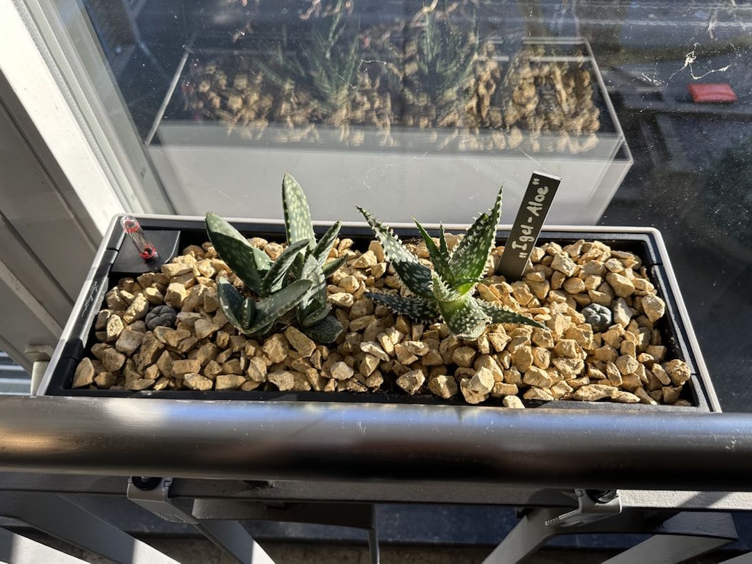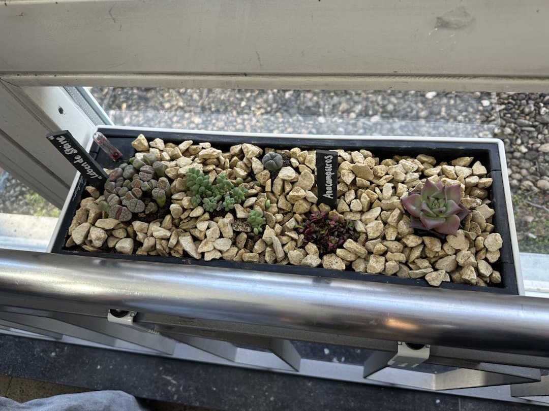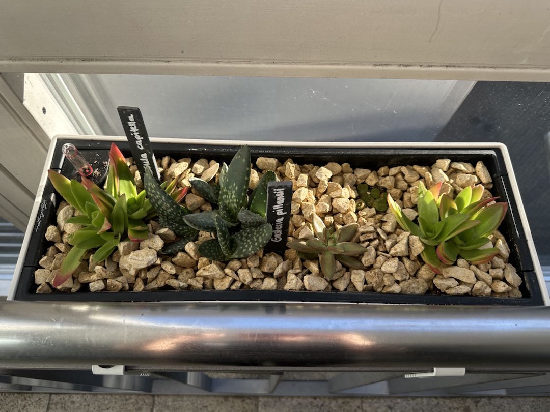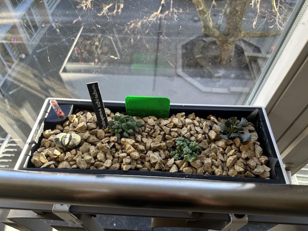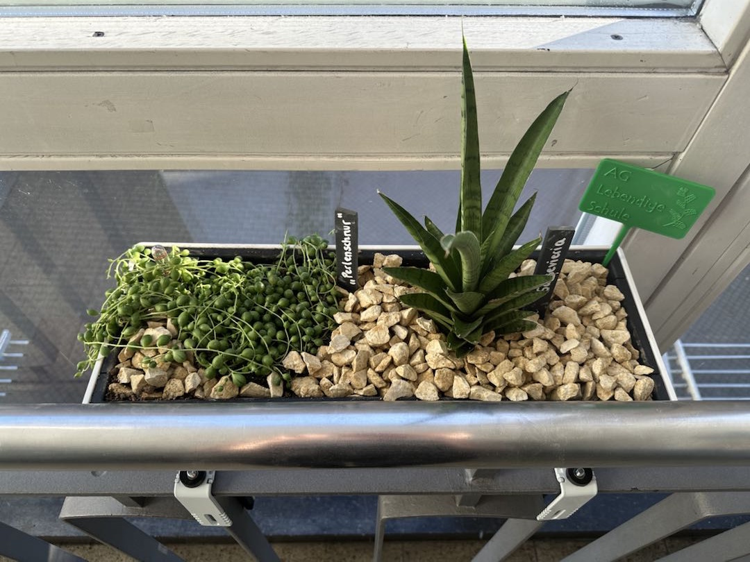 Die neue AG Lebendige Schule hat sich zum Ziel gesetzt, das Schulhaus durch Pflanzen freundlicher zu gestalten. Hierfür wollten wir die vorhandenen Pflanzen nutzen, aber auch weitere, neue Pflanzen hinzufügen. Nachdem wir uns im letzten Schuljahr auf die Vorhandenen konzentriert, ihre Erde erneuert und die Töpfe gereinigt haben, sollte es in diesem Schuljahr an die neuen Pflanzen gehen. Und so begannen wir im Herbst, Ideen zu sammeln, wie und wo die neuen Pflanzen platziert werden könnten. Nach den ersten Recherchen stellten wir fest, dass dies gar nicht so einfach und auf vieles zu achten ist: Wo passen neue Töpfe hin, ohne im Weg zu stehen? Welche Pflanzen können in der Schule verwendet werden? Licht, Luftfeuchtigkeit und auch Wasser sind Faktoren, die bedacht werden mussten. Schnell stand unsere Idee fest: Die Geländer im Treppenhaus boten eine gute Gelegenheit dafür. Nachdem die Schulleitung uns unsere Idee sofort genehmigt hatte, fingen wir an, passende Töpfe zu suchen. Beim Designen der Pflanzenkombinationen wurde unsere Gruppe sehr kreativ und Mitte Februar stand den Besorgungen nichts mehr im Weg. Mit den Designs in der Tasche ging es für einen kleinen Teil der AG für einen Samstagnachmittag ins Gartencenter, und Herr Eberle besorgte uns freundlicherweise die Töpfe. Am Mittwoch, dem 25. Februar 2026, trafen sich dann 5 Schüler:innen mit Herrn Schmidberger und Frau Bertram am Nachmittag, um unsere Idee in die Wirklichkeit umzusetzen. Mit viel Liebe wurde jeder einzelne Topf mit verschiedenen Sukkulenten, Lebenden Steinen, Aloe Veras und vielem mehr befüllt. Einer unserer Mitglieder überraschte uns noch mit selbstgedruckten AG-Schildern, die zusammen mit einzelnen Beschriftungen einen Ehrenplatz erhielten. Und so haben wir unserem Treppenhaus ein wenig Leben eingehaucht. Vielleicht zaubert es ja auch Dir bzw. Ihnen ein Lächeln ins Gesicht? Wir wünschen allen viel Spaß beim Anschauen und Bestaunen!