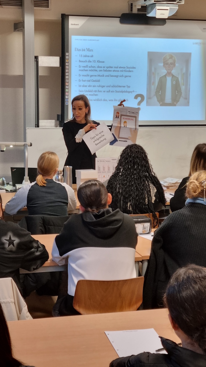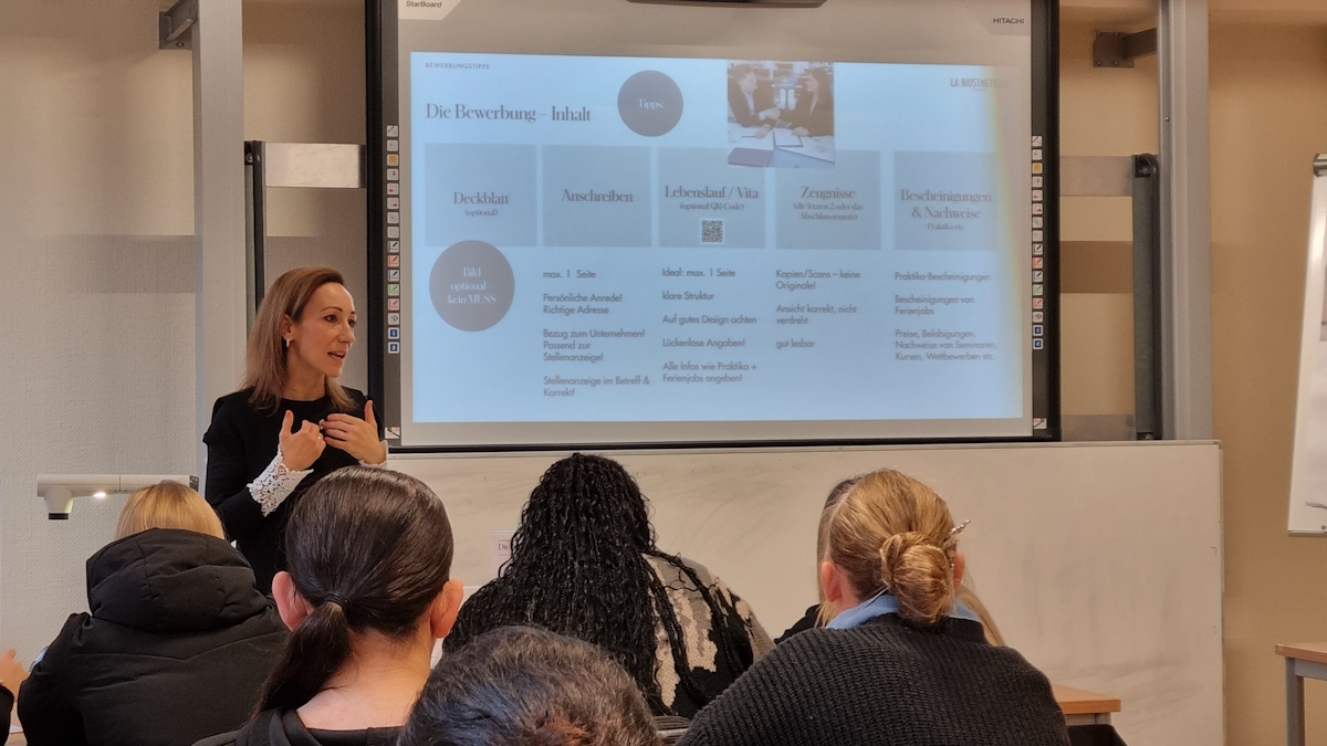 Im Oktober 2025 nahm sie unsere 10. Klassen mit auf eine zweistündige Reise durch die Welt der Bewerbung – lebendig, praxisnah und mit zwei KI-Avataren namens Mia und Max, an deren Beispiel sie gemeinsam mit den Schüler:innen Schritt für Schritt erarbeitete, worauf es wirklich ankommt. Ein klassisches Anschreiben besteht aus Deckblatt, einem maximal einseitigen Motivationsschreiben („Nicht länger!“, betont Hohl), Lebenslauf und Zeugnissen. Doch all das bleibt oberflächlich, wenn man sich vorher nicht mit den eigenen Interessen, Stärken und Wünschen beschäftigt hat.